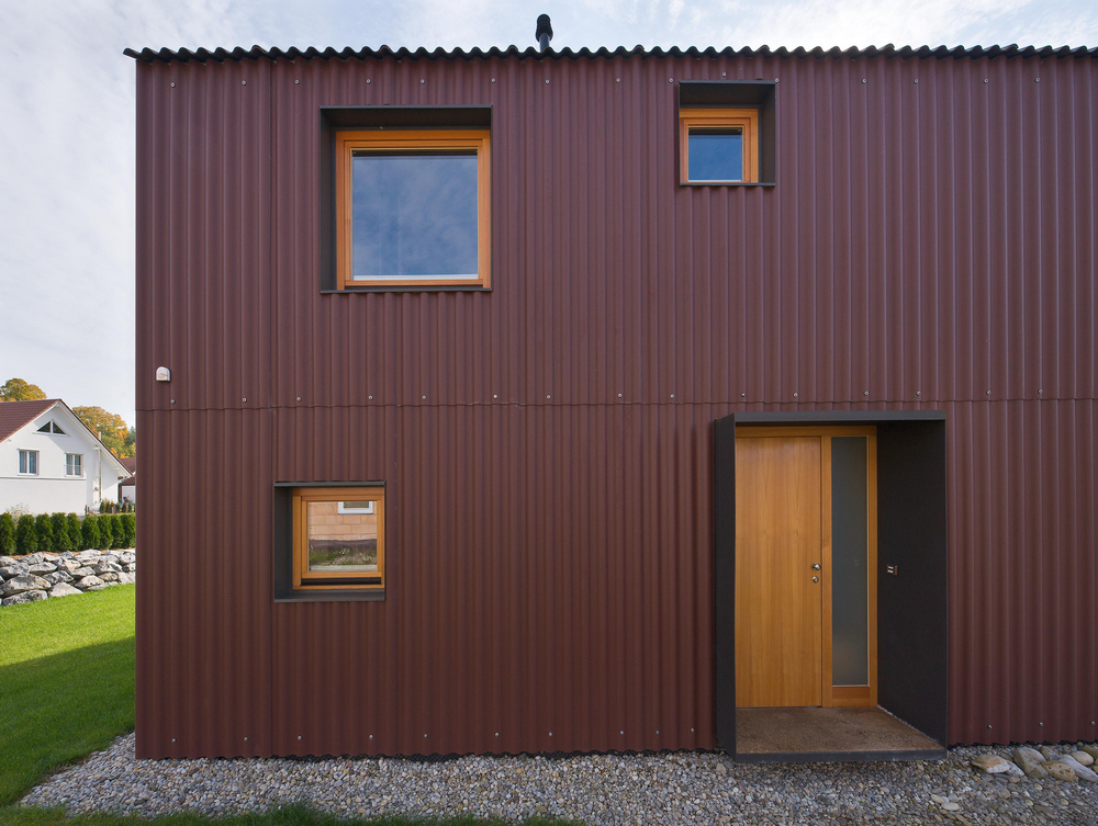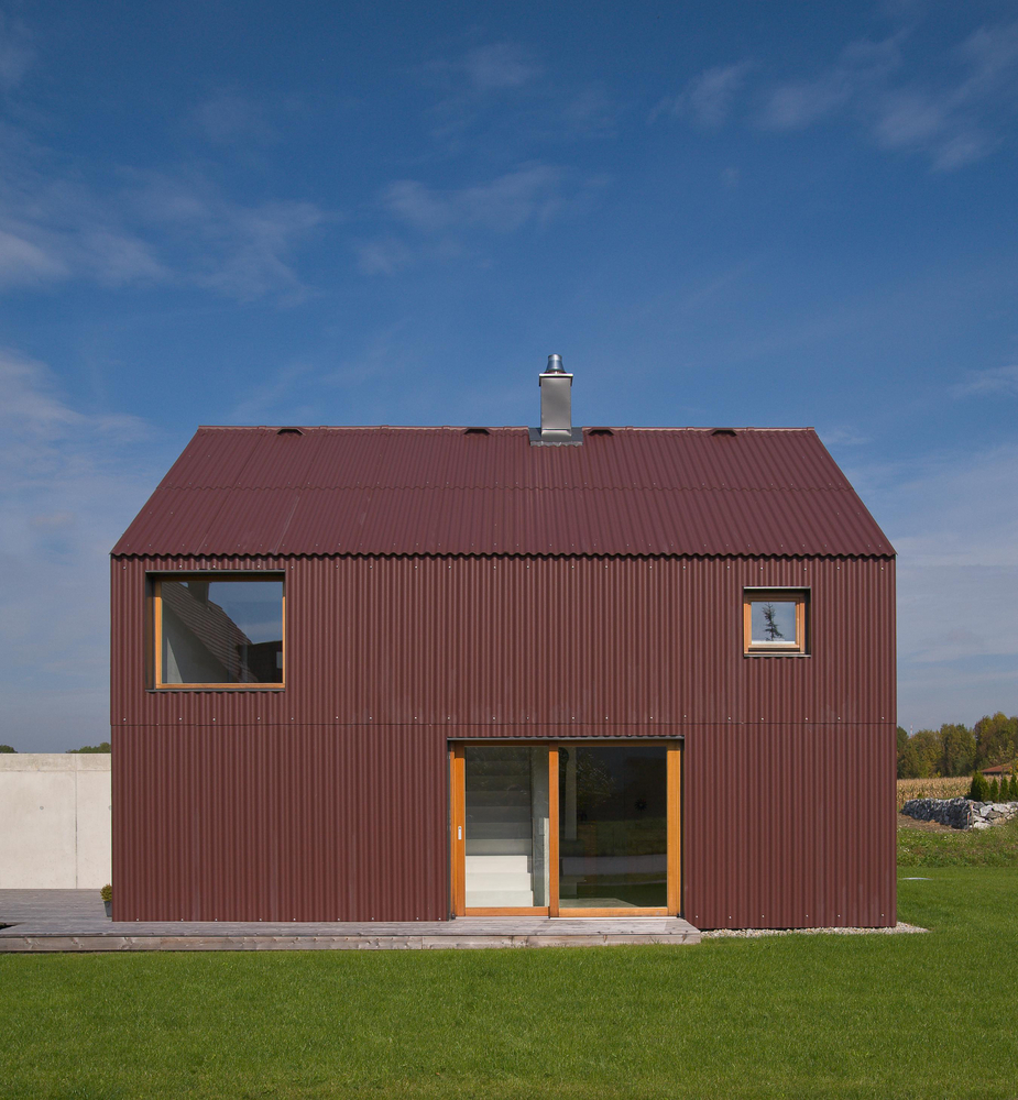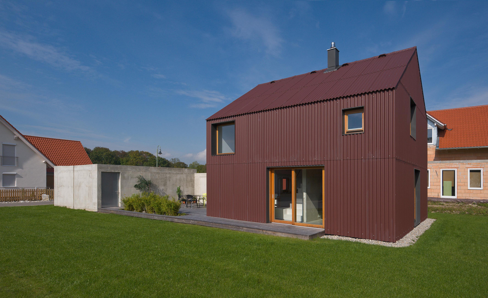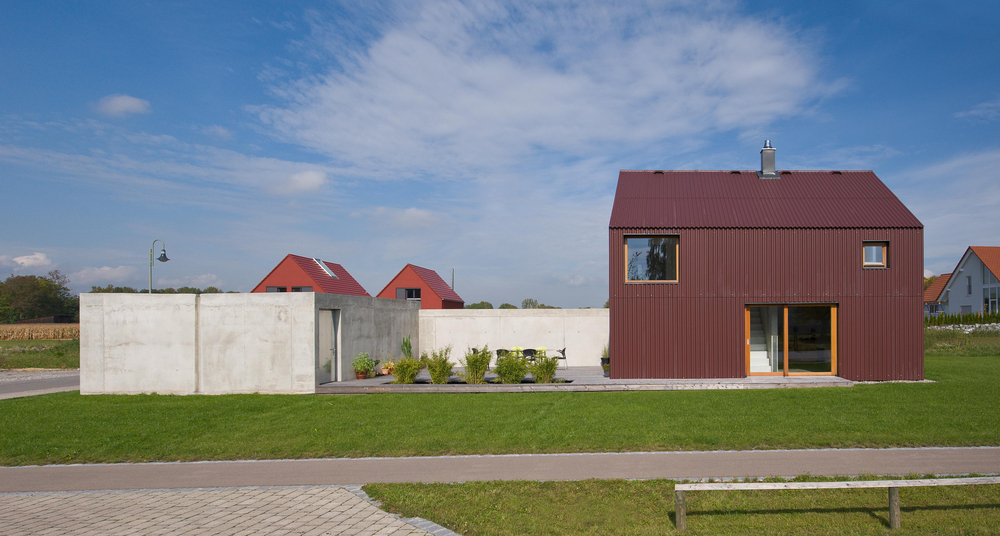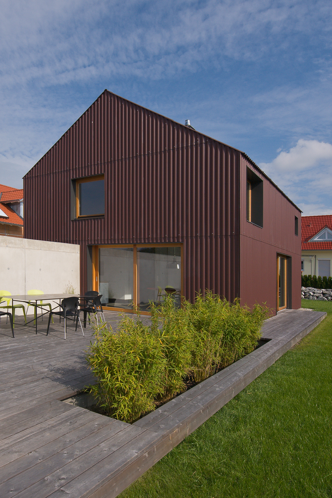 Eine Neuinterpretation des klassischen Einfamilienhauses findet sich in der Unterallgäuer Gemeinde Heimertingen. Nach den Plänen von Alex Nägele (SoHo Architektur) entstand ein Gebäude mit einer klaren minimalistischen Formensprache, das den engen Grenzen des vorgegeben Bebauungsplans gerecht wird und sich dennoch einer modernen Architektursprache bedient. Prägendstes Stilelement der Außenhaut sind die rostbraunen Wellplatten von Eternit, die sowohl das Dach als auch die Außenwände des Baukörpers umhüllen. Ihre hohe Stabilität bei geringem Gewicht ermöglicht die Verwendung für die gesamte Gebäudehülle. Die Platten sind sichtbar auf die darunter liegende Holz-elementkonstruktion verschraubt. Gezielt gesetzte Fenster und Öffnungen stellen einen starken Bezug zu den Außenbereichen her. Der Neubau wurde für zwei Bewohner konzipiert und bietet auf zwei Geschossen eine Wohnfläche von insgesamt 90 Quadratmetern. Über dem Esszimmer ist ein Luftraum ausgespart, der die Geschossebenen miteinander verbindet und eine großzügige Raumwirkung erzielt. Eine Garage mit Betonwand schirmt das Gebäude zur Straße hin ab. An der am Haus angrenzenden Holzterrasse schafft ein Pflanzen-becken einen privaten Außenraum.