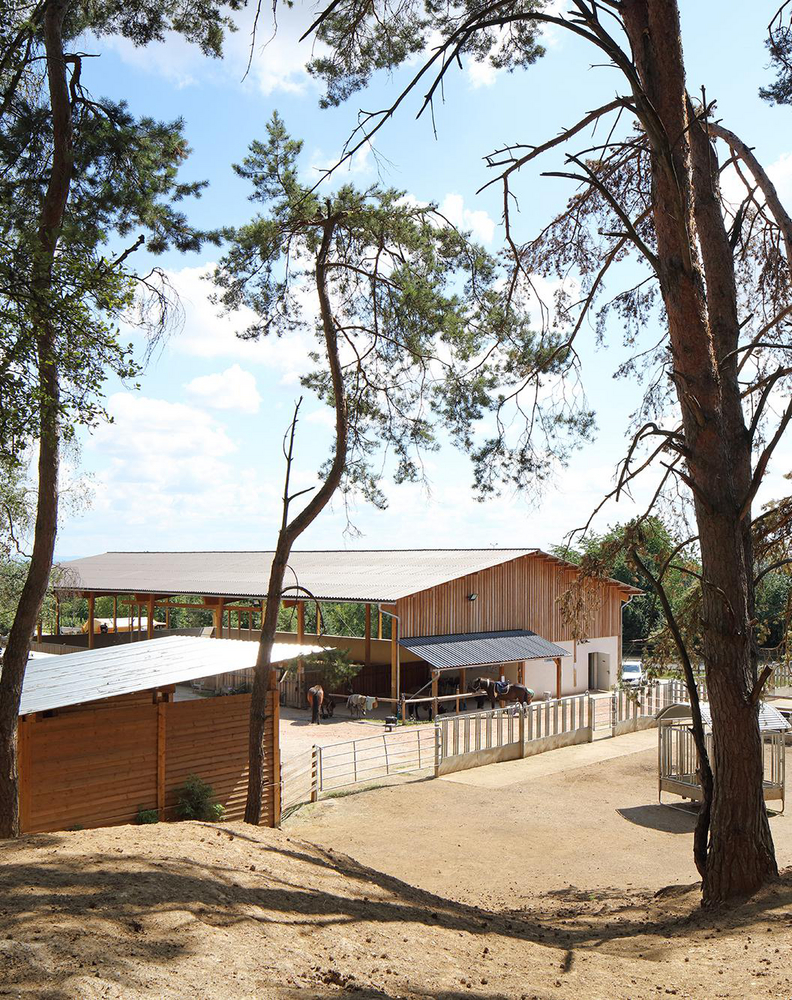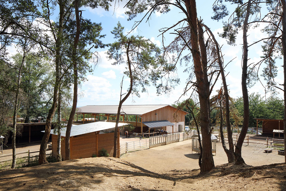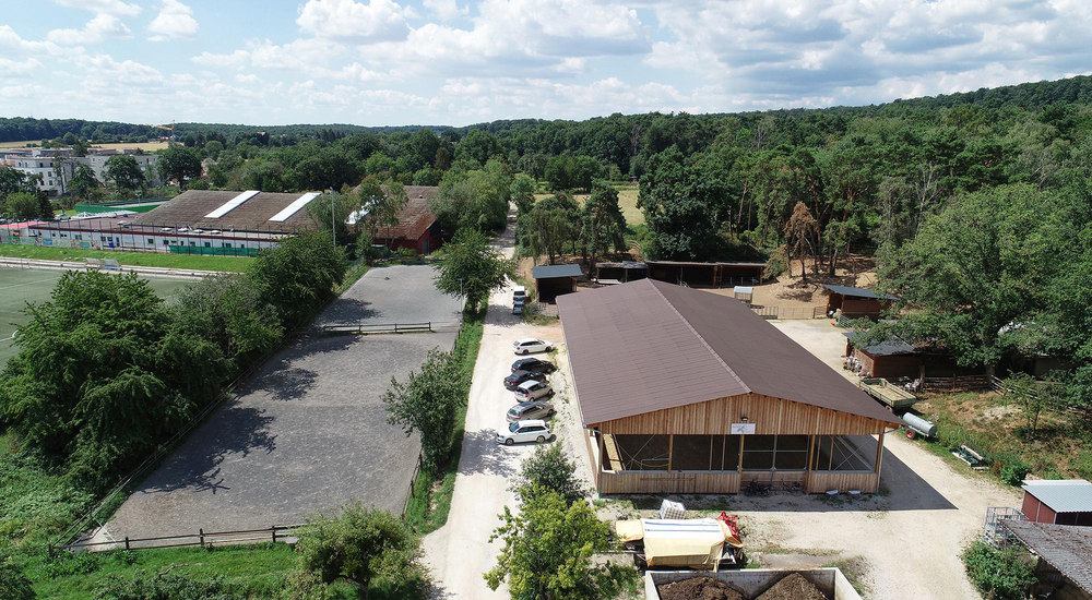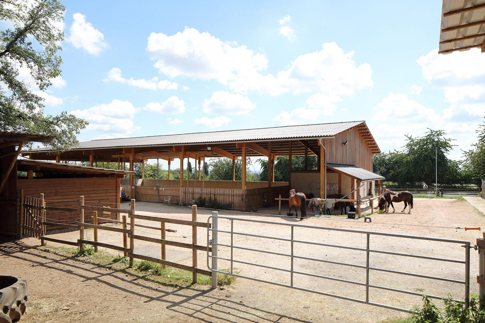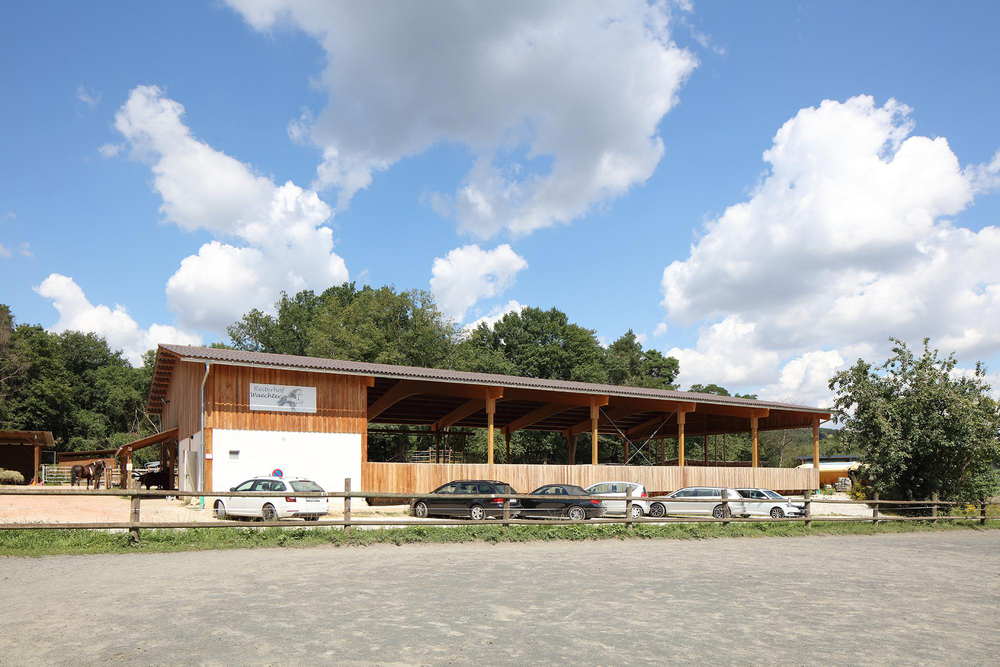 Die moderne Reithalle aus Holz bietet viel Platz für die Reiterinnen und Reiter, die auf dem Wächterhof Zeit mit ihren Pferden verbringen. Auch die angeschlossene Reitschule nutzt die Halle. Vor Regen und Wind geschützt bestehen auf 18 x 36 Metern Fläche optimale Voraussetzungen für Mensch und Tier. Eine Sattelkammer ist ebenfalls im Gebäude untergebracht.