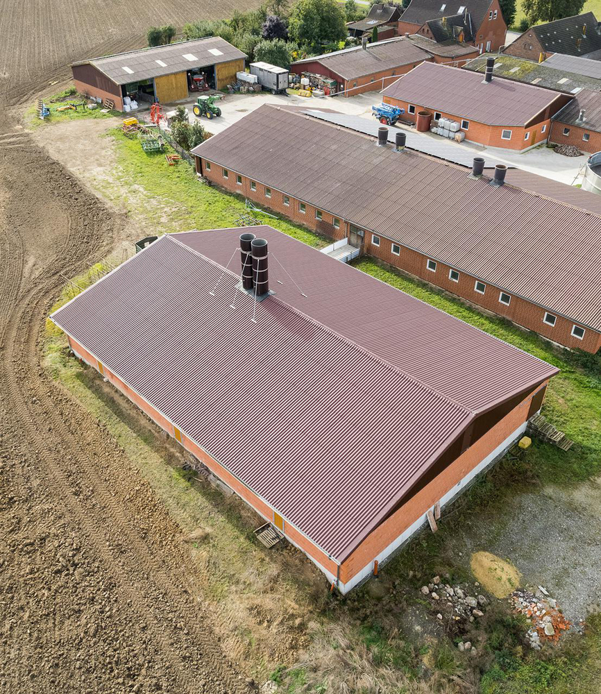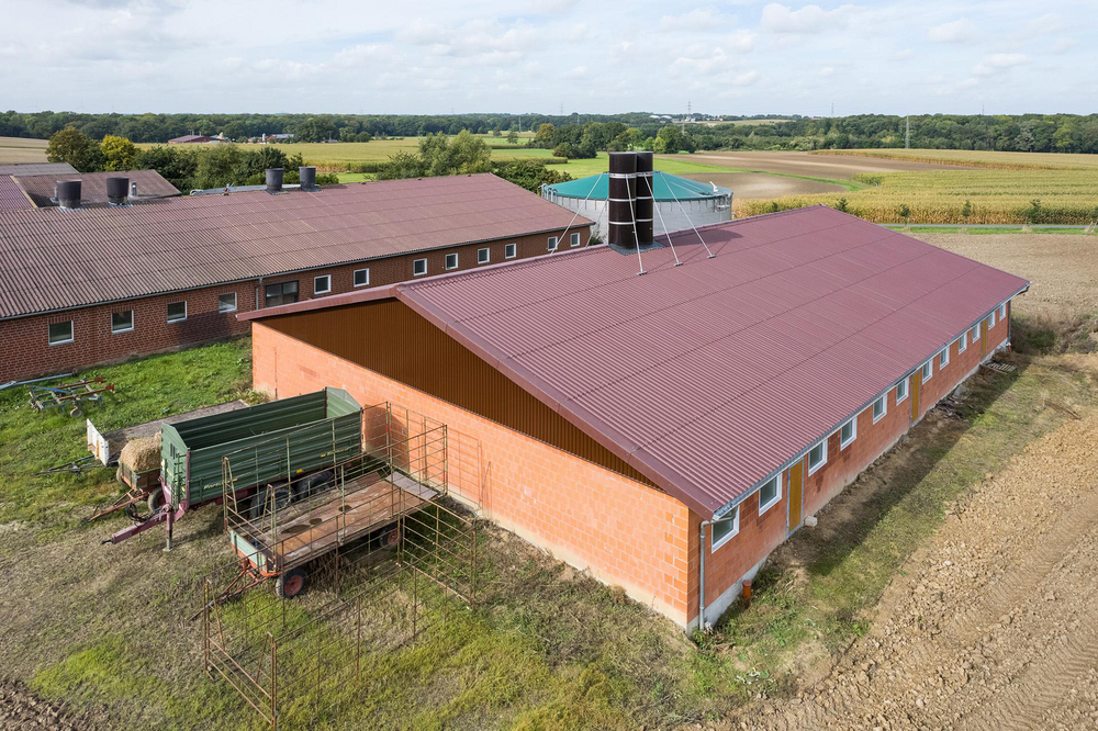 In Hamm wurde im April 2020 ein Gebäude zur Tierhaltung, das komplett neu errichtet wurde, mit Eternit Wellplatten eingedeckt. Der moderne Schweinemaststall bietet genug Fläche für insgesamt 500 Schweine. Auf dem Dach der Anlage kamen unsere Eternit Wellplatten Profil 6 ¾ zum Einsatz – diese bieten neben der markanten rostbraunen Optik außerdem stark klimaregulierende Eigenschaften. Die Wellplatten helfen bei der Regulation der Luftfeuchtigkeit im Innenraum und halten zudem an warmen Tagen die Hitze ab, sodass die Tiere im Stall weniger Stress ausgesetzt sind. Damit stellt gerade dieses Platten-Profil eine starke Lösung für die Vieh- und Landwirtschaft dar.